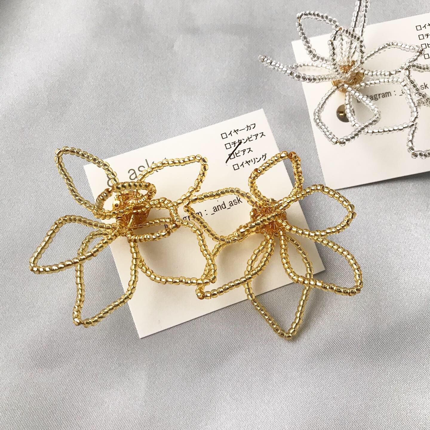 ビーズとワイヤーで大きなお花を♡ イヤリングだと片耳に2つつけても可愛い作品です