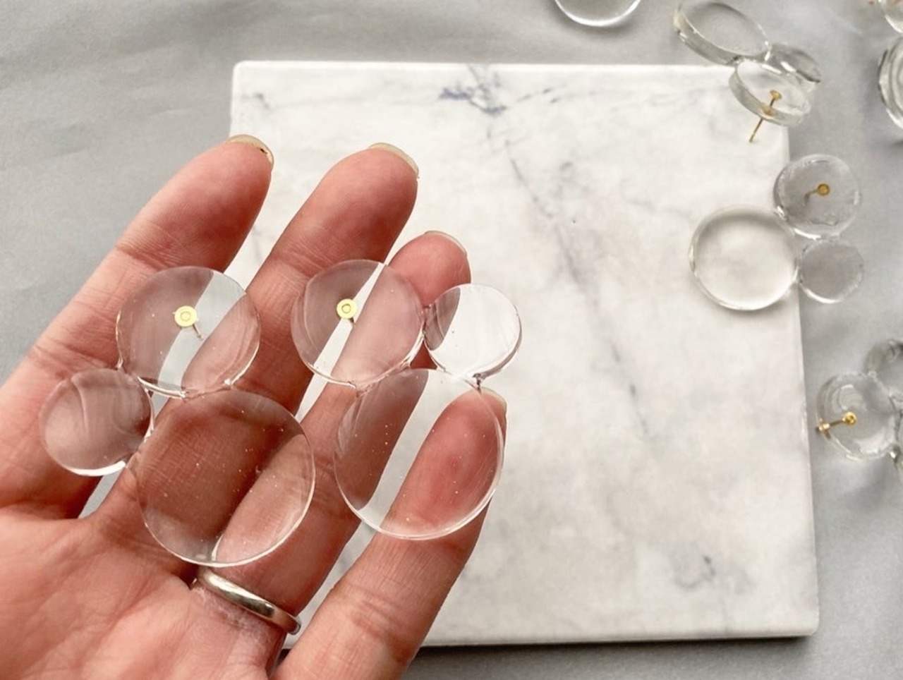 3つの異なるサイズの丸を合わせたクリアで涼しげな耳飾りです