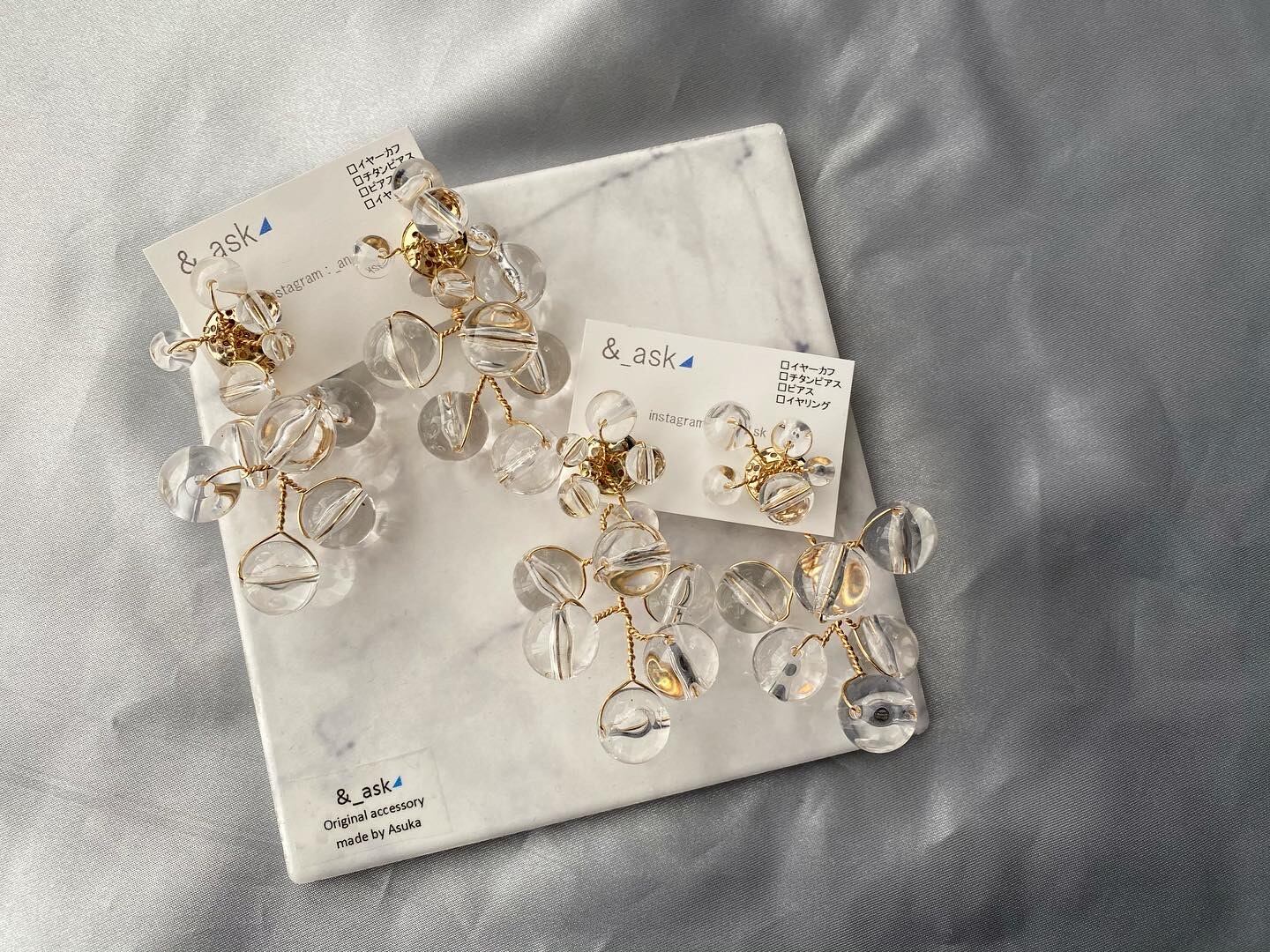 大小様々なアクリルビーズを使用してぶどうのようにデザインした耳飾りです