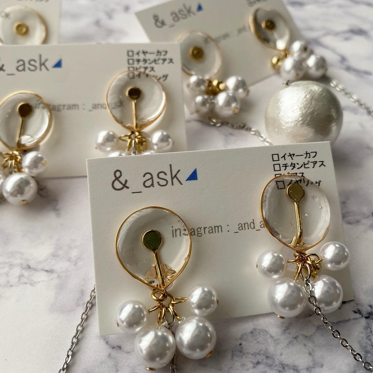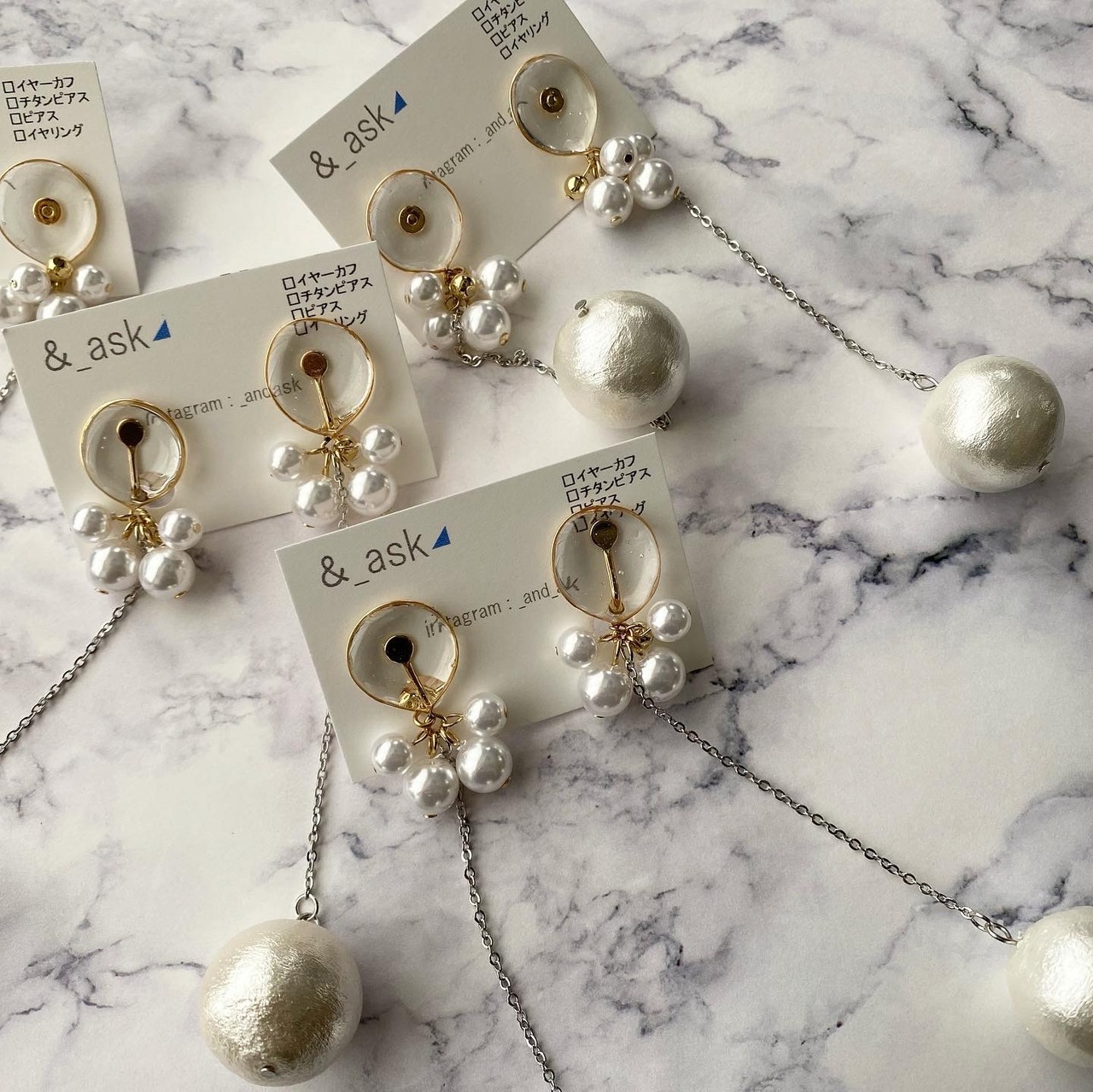 ぶら下がってる大きめコットンパールと耳元の小さなパールがとっても可愛い