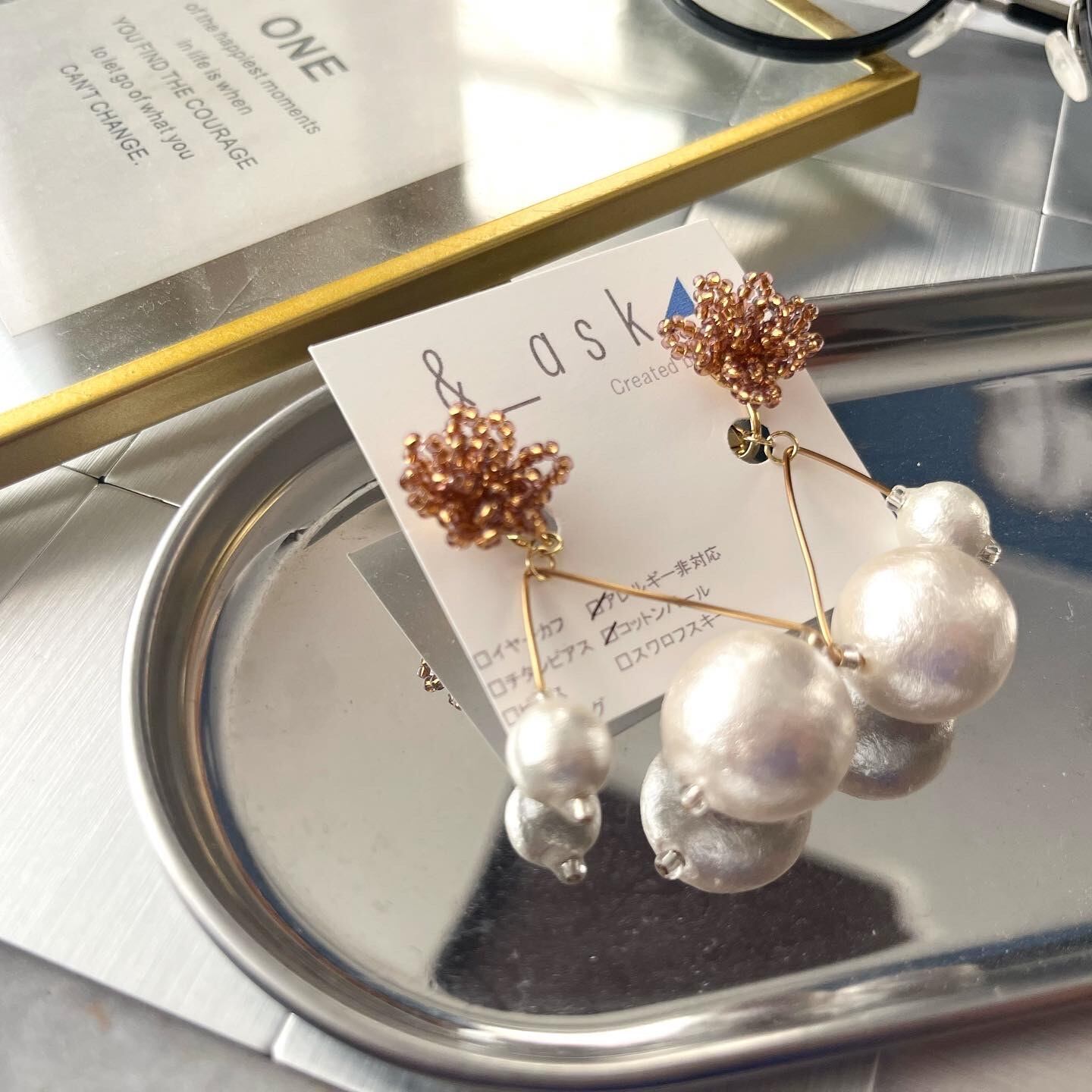 お花をイメージしたビーズに大きなコットンパールを合わせて どんなスタイルにも合います